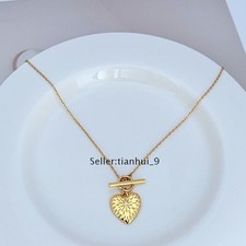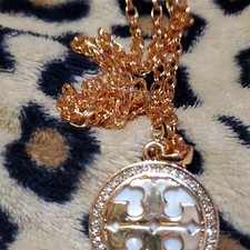 This Tory Burch necklace features a delicate gold chain with adjustable length, fitting perfectly. The center is adorned with an elegant circular pendant, featuring Tori Birch's signature logo. The logo is surrounded by transparent multi-faceted crystals, adding a touch of brilliance and elegance.