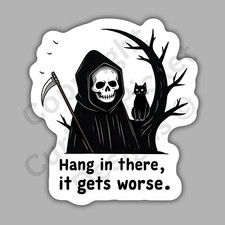 Hang In There It Gets Worse Grim Reaper Funny 3" Vinyl Sticker | ✔ Check At Store | $3.49 |