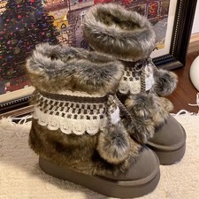 Women's Faux Fur Winter Snow Boots Fuzzy Fluffy Mid-Calf Flat Y2K size 9 Yeat