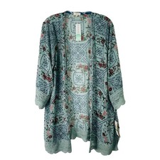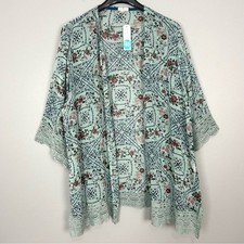 Design details: Open front silhouette with no closures, wide 3/4 kimono sleeves, vertical floral stripe layout, and scalloped crochet lace trim at cuffs and hem. Material: Self 100% rayon lightweight woven fabric with soft drape; contrast crochet lace trim 100% cotton; made in China.