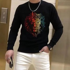 New Men Luxury Diamond Lion Rhinestones Fashion Black White T-Shirt High Quality