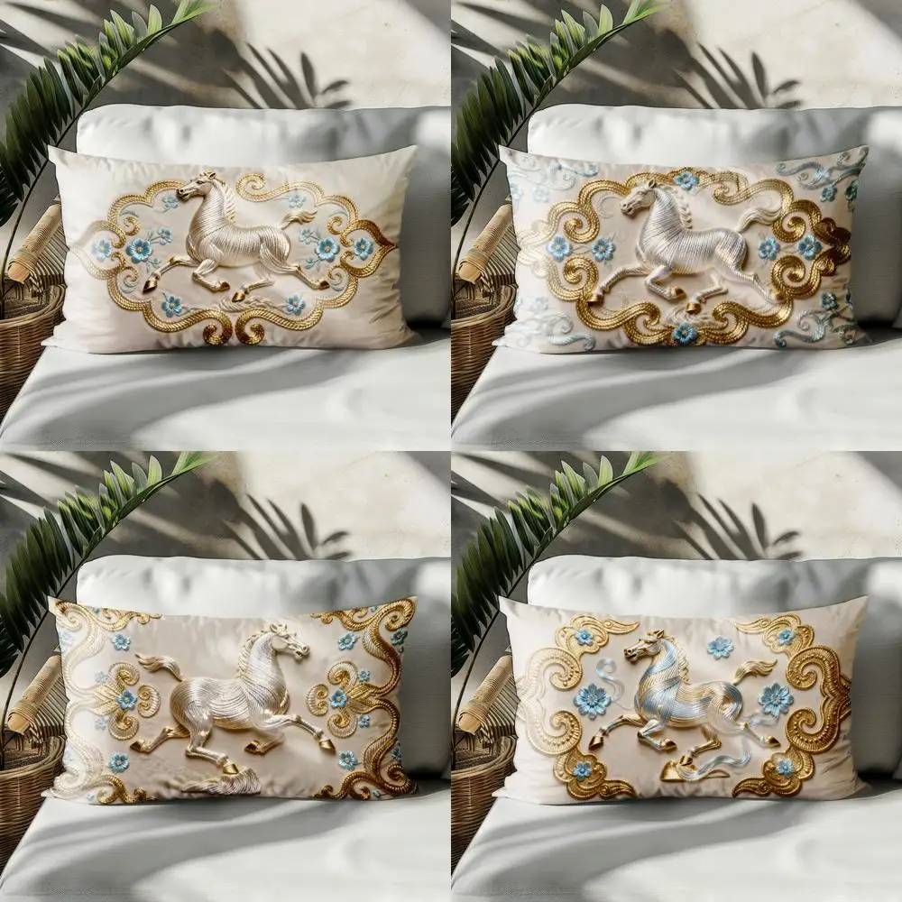 2D Running Horse With Floral Ornament Suitable For Sofa Bedroom Car Pillow Cover Cushion Rectangular Back Cushion