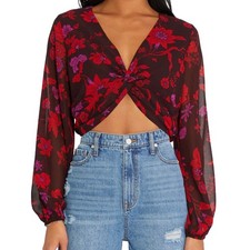 Chiffon fabric. Pit to pit: 19”. Twist detailing. Floral pattern. Long sleeve with elastic cuffs. Red and dark purple in color. 100% Polyester. We appreciate you.