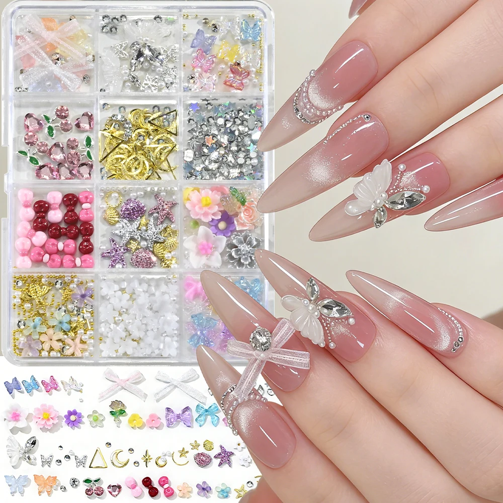 12Grid/box Mixed Crystal Pearl Butterfly Nail Art Decoration DIY Camellia Flower Nail Charms Alloy Bow Diamond Nail Supplies