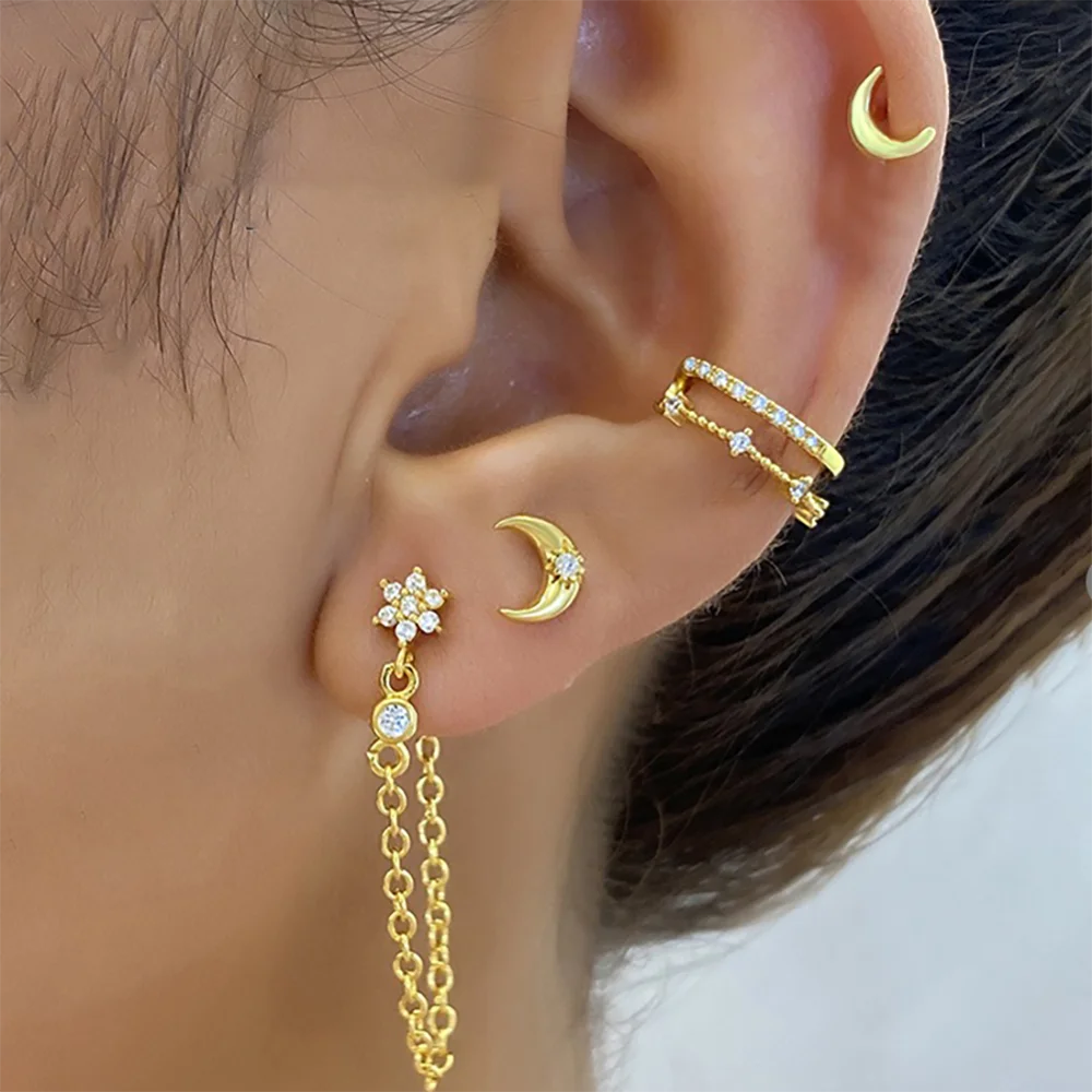 4PCS Light Luxury Stainless Steel Gold Color Moon Stud Earring Set For Women Flower Chain Ear Stud Zircon Statement Jewelry