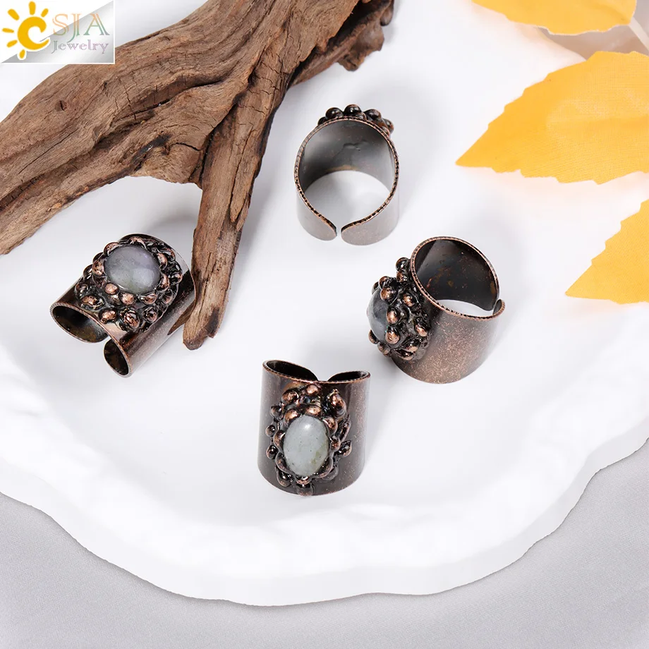 CSJA Flash Labradorite Bronze Finger Rings for Women Man Natural Gem Stones Ring Open Adjustable Rings Jewelry Gift H732
