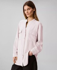 Styled in smooth crepe, this Calvin Klein shirt is a relaxed pick designed with a band collar and long sleeves. Band collar; front button closures. Machine washable.