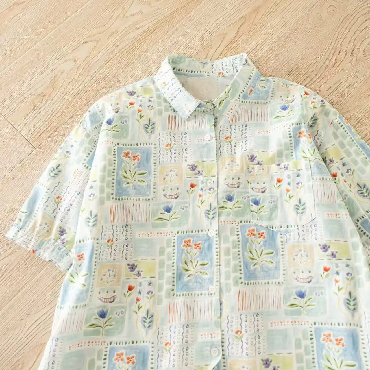 Blouse made of light viscose. Free silhouette. The front of the blouse is decorated with a wide placket. The bottom is secured at the sides with an elastic band. The back of the blouse is decorated with small pintucks.